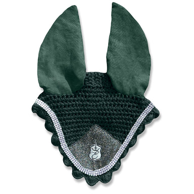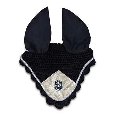 Gorgeous fly hat with sparkly champagne patch and silver edge. Black Base Color. Protects from the flies so the horse and the rider can focus bett...