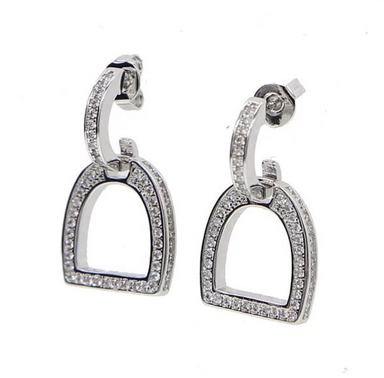 Sterling silver earrings inspired by classic English stirrup design, adorned with sparkling pave cubic zirconia crystals that catch the light beaut...