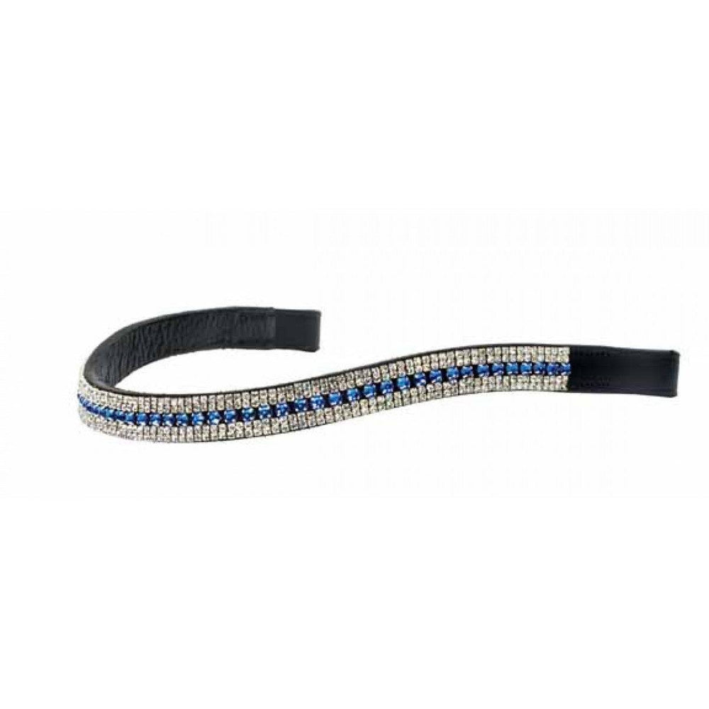 Blue stones flanked by princess clear stones, on a shaped black browband.